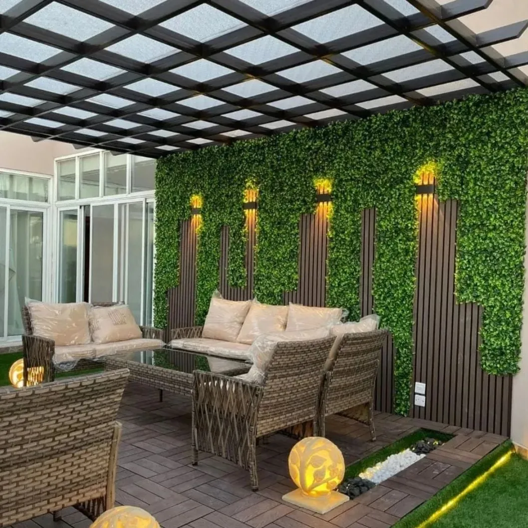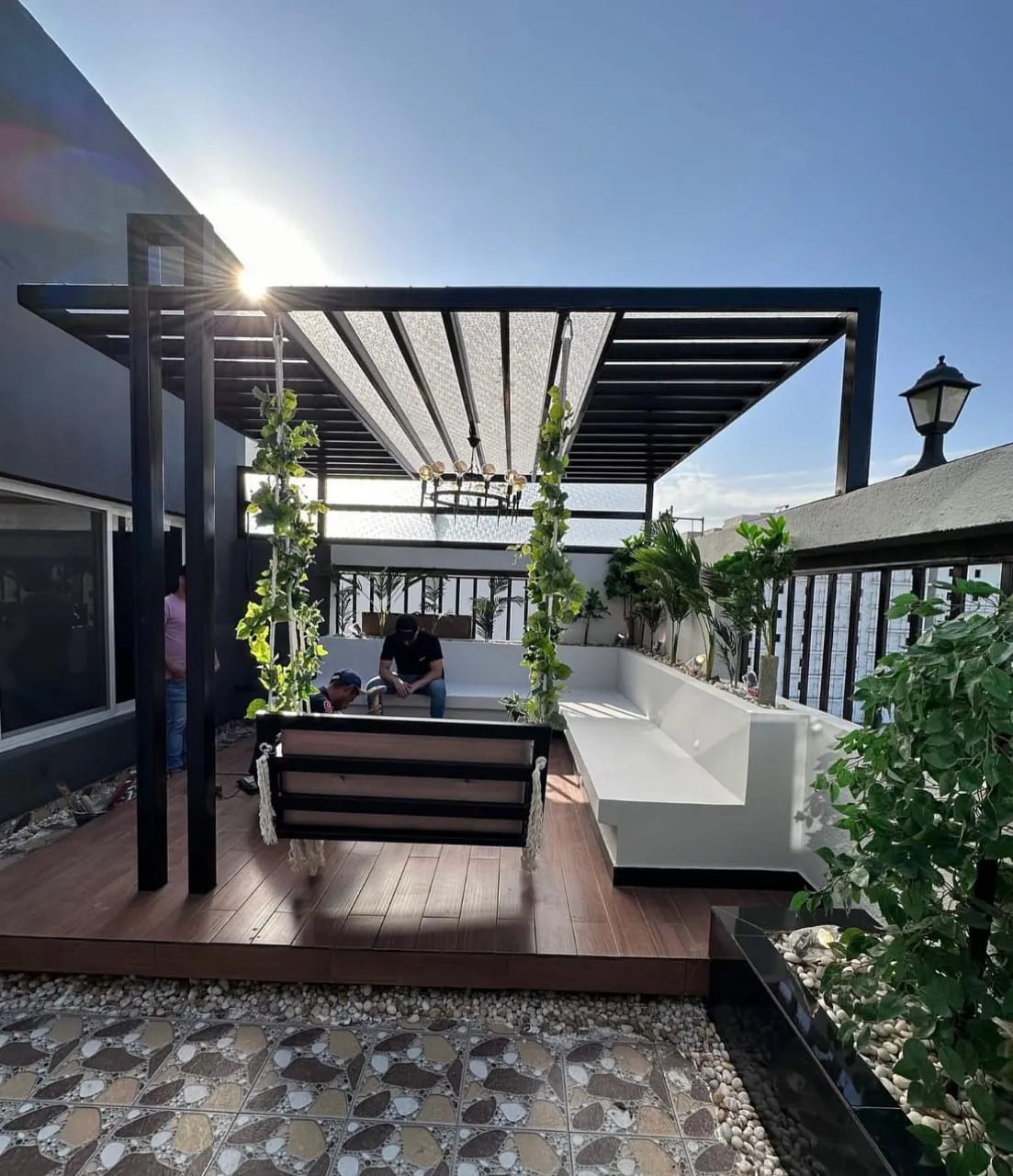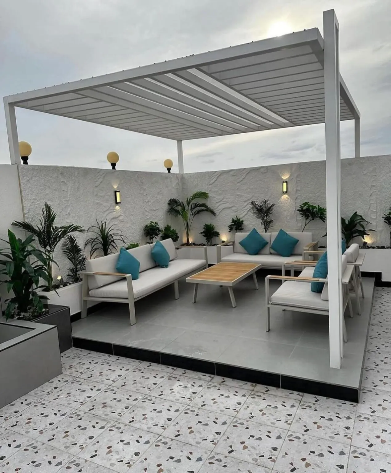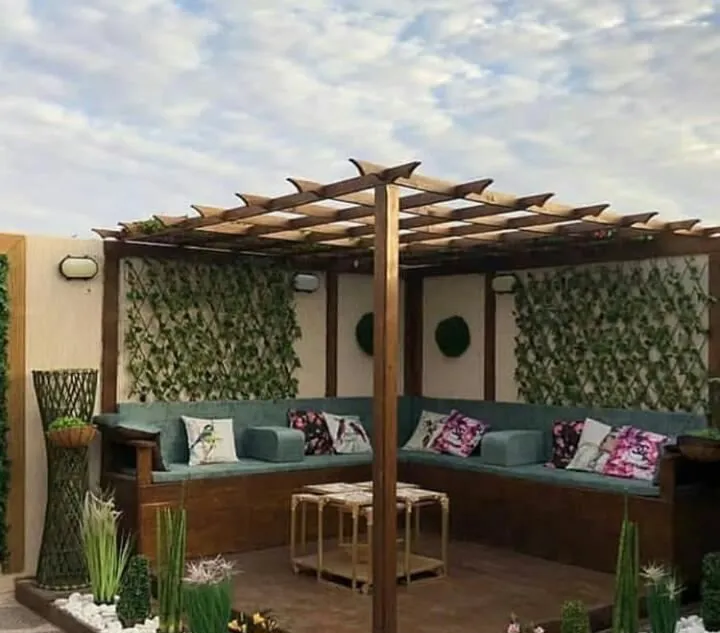 الأسقف: يُفضل استخدام ألواح الخشب المعالج أو الألومنيوم، أو حتى تصميم سقف مفتوح مع عوارض خشبية لتوفير الظل وإضافة لمسة جمالية.