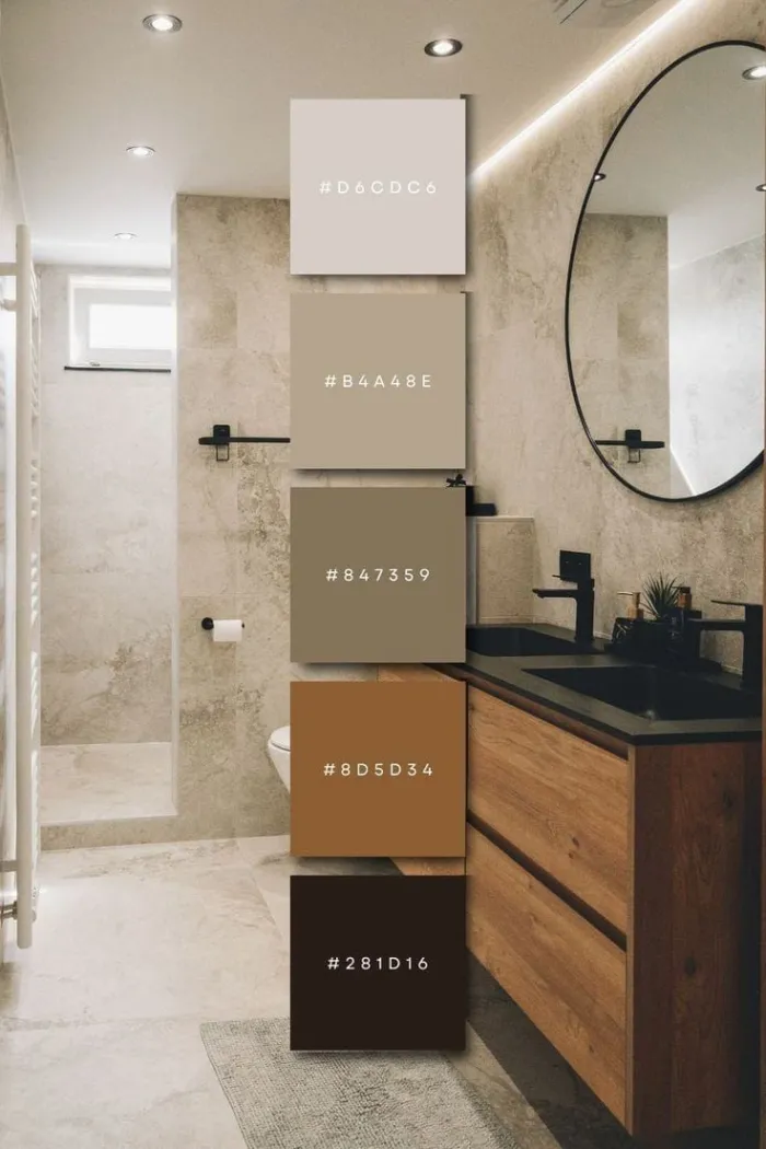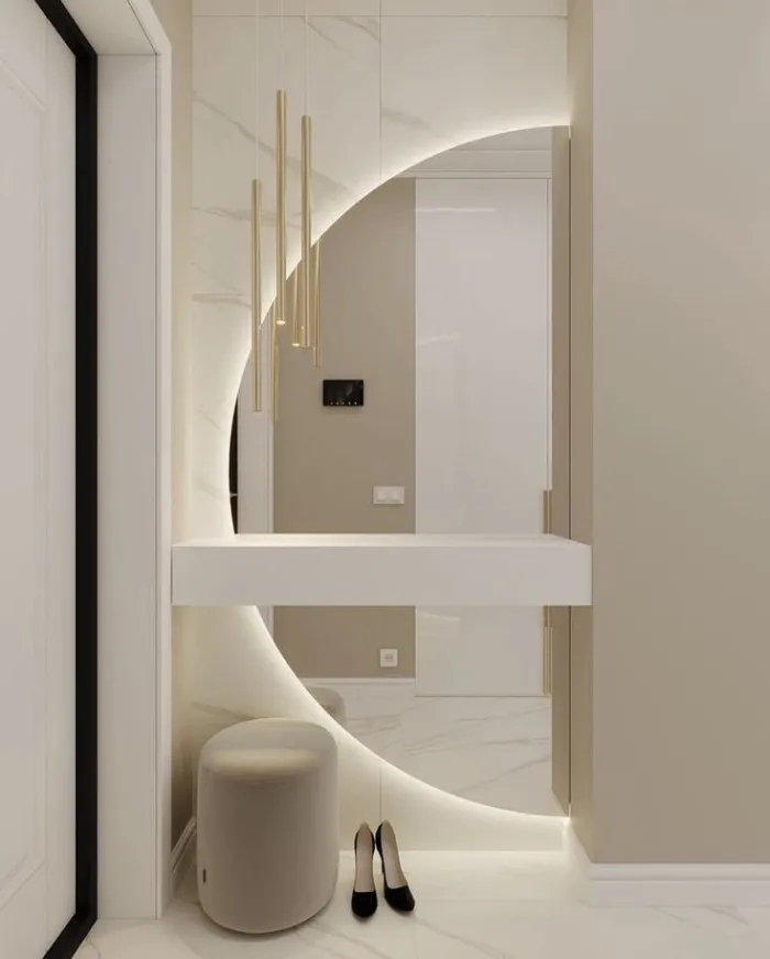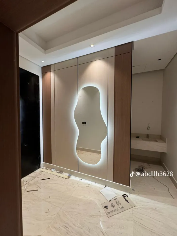 العناصر: استخدام واسع لـ بديل الرخام (الذي يتميز بالفخامة والمقاومة للرطوبة)، إنارة بروفايل مخفية، وأسقف روز رايز لإضافة لمسة جمالية مضيئة.