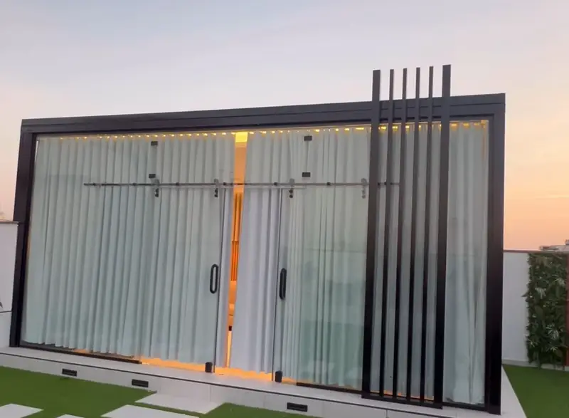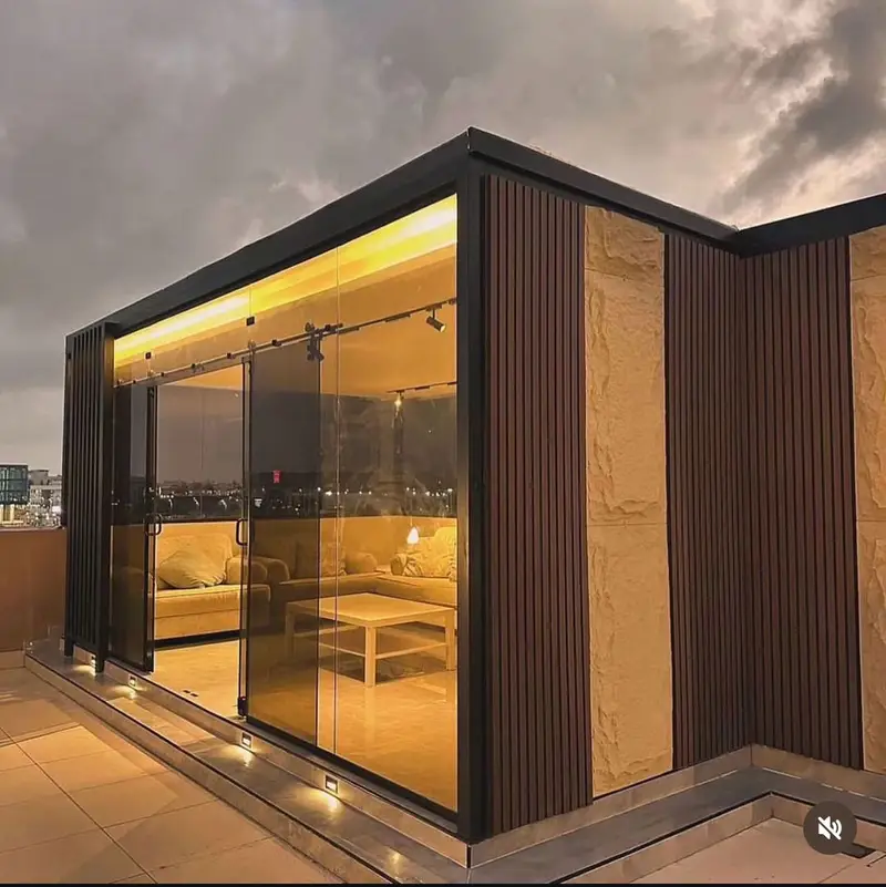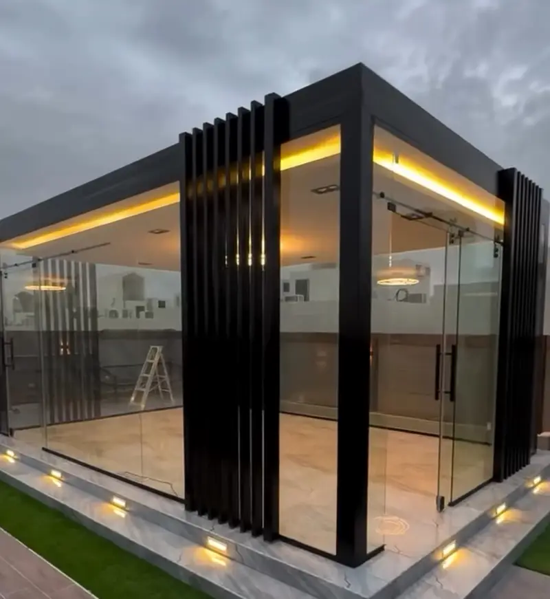 - المجالس المفتوحة جزئياً: تتميز هذه المجالس بجمعها بين التهوية الطبيعية والخصوصية. يمكن أن تكون على شكل أعمدة وسقف يوفر الظل (مظلة خارجية فاخرة)، مع إمكانية إضافة سواتر خشبية أو ستائر جانبية قابلة للطي.