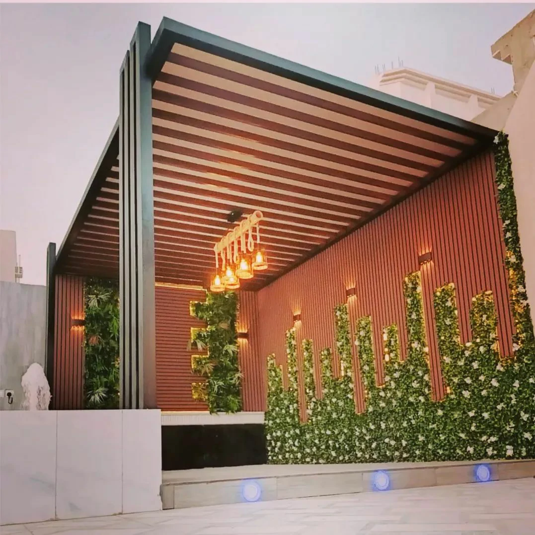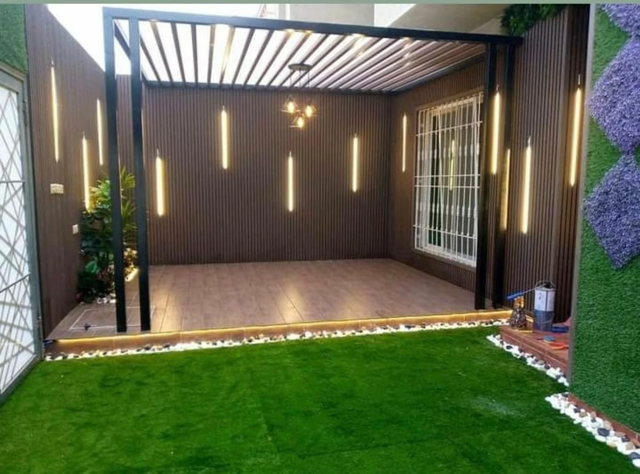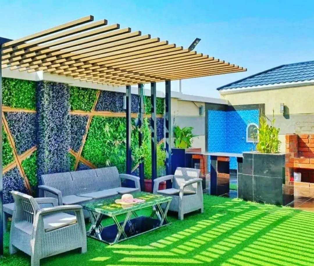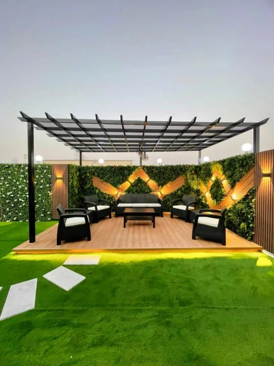 - المظلات والبرجولات: استخدام مظلات خشبية (برجولات) أو معدنية بتصاميم مودرن أو تقليدية يوفر حماية من الشمس ويحدد مساحة الجلوس.