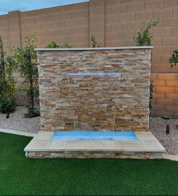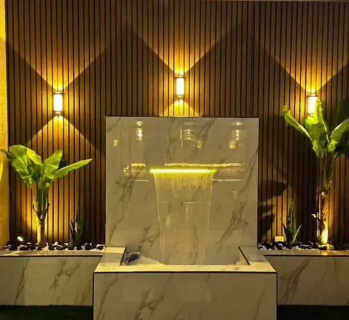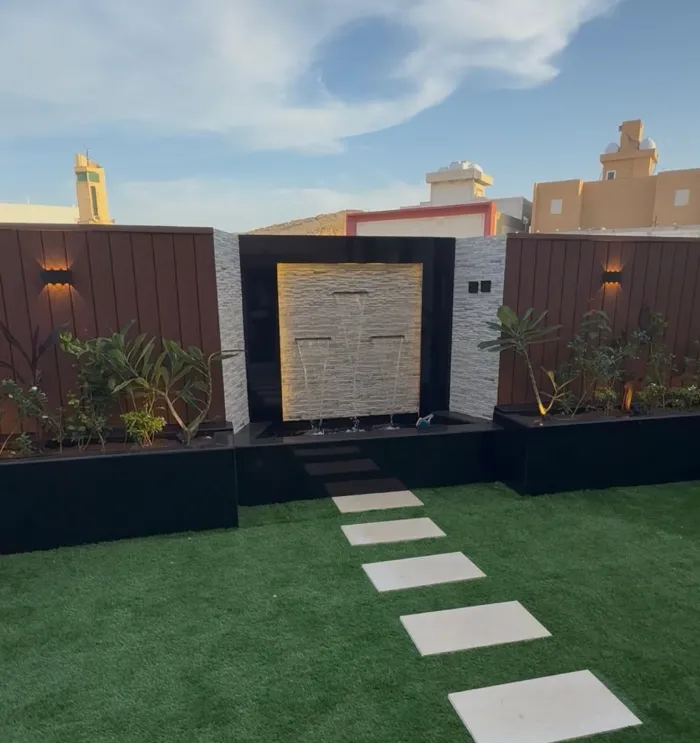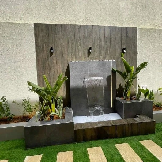 - الأرضيات: يفضل استخدام الأرضيات المقاومة للرطوبة والحرارة، مثل البورسلان الخارجي، أو البلاط المتشابك، أو حتى بديل الخشب (WPC) حول منطقة الجلسة والشلال.